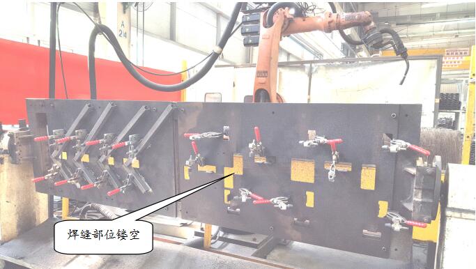 焊缝分布统一且具备一定批量的制件采用机器人焊接可操作性较强,并且工装一般采用厚板料割洞、镂空的方式,便于对工件姿态调整后的背面焊缝施焊。