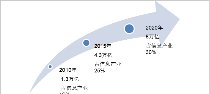 十二五期间,我国软件与信息技术服务业飞速发展,产业业务收入总和由2010年的1.3万亿元增至2015年的4.3万亿元,5年累计增幅超过230%,年均复合增速高达27%,在信息产业收入中的比重,由2010年的16%提高至2015年的25%,增加了9个百分点。