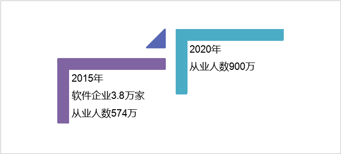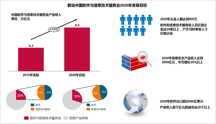 例如,在产业规模方面,“规划”将2020年目标定量为:到2020年,软件和信息技术服务业业务收入突破8万亿元,年均增长13%以上,占信息产业比重超过30%,其中信息技术服务收入占业务收入比重达到55%。信息安全产品收入达到2000亿元,年均增长20%以上。软件出口超过680亿美元。软件从业人员达到900万人。